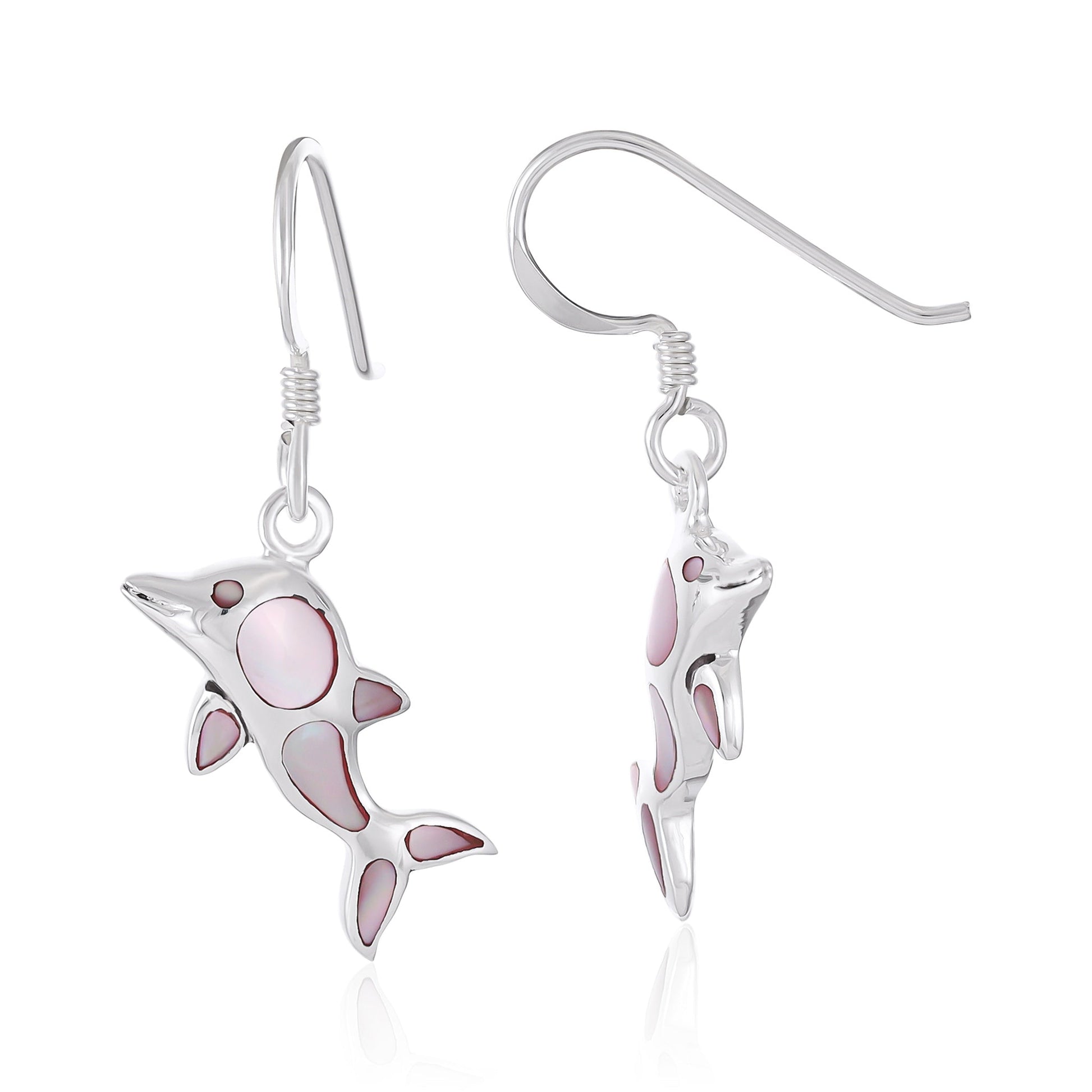 Get ready to shimmer with our Sterling Silver Mother Of Pearl Shell Dolphin Earrings.